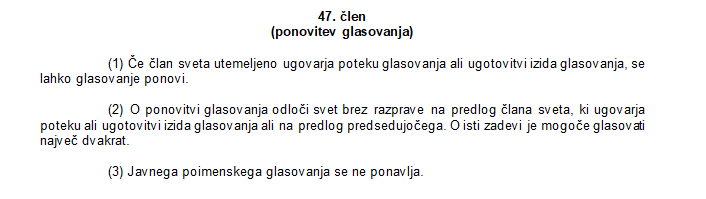 »Če ni bilo razlogov za ponovno glasovanje, pa je to lahko problem. Zato bi bilo treba preveriti, zakaj so sploh glasovali ponovno – ali je bil rezultat nejasen, ali pa so člani občinskega sveta zatrjevali, da so se pri glasovanju zmotili. To so lahko legitimni razlogi za ponovno glasovanje. Samo dejstvo, da je bilo glasovanje ponovljeno, je lahko sporno, če za to niso obstajali poslovniški razlogi.«