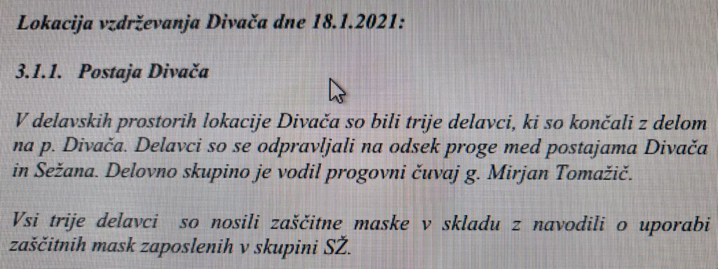 Objavljamo primer enega od zapisnikov o izrednem nadzoru (v uredništvu jih hranimo več) na območju Divače, ko so inšpektorji železnic v obdobju covida-19 preverjali samo nošenje mask, brezhibnosti prog, železniških vozil in drugih varnostnih protokolov pa ne.