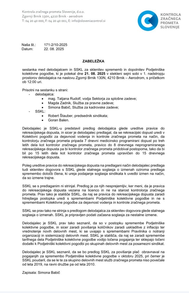 Iz zapisnika sestanka med upravo in sindikatom iz avgusta 2025, ki smo ga pridobili, izhaja, da je vodstvo Kontrole zračnega prometa sindikatu predstavilo predlog, da bi rekreacijski dopust uredili po t. i. »avstrijskem modelu«. Predlagali so, da bi kontrolor po treh letih dela pridobil pravico do sedemdnevnega programiranega dopusta (npr. v termah), po petih letih pa bi mu postopoma dodali še neprogramirani dopust. Po 15 letih zaposlitve bi prišel do enakih pravic, kot jih imajo danes, torej do sedemdnevnega programiranega dopusta v termah in osmih dodatnih dni prostega časa.