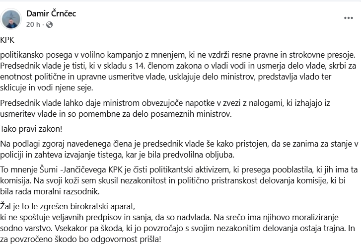 Po objavi poročila so se v bran premierju hitro postavili tudi njegovi politični sateliti – ljudje, ki jim je oblast omogočila udobne položaje in dolgoročne posle, zato zdaj v strahu pred izgubo privilegijev napadajo institucije nadzora. Najglasneje je reagiral Damir Črnčec: KPK je na svojemm FB profilu obtožil vmešavanja v predvolilni boj in ji ob tem še odkrito zagrozil.